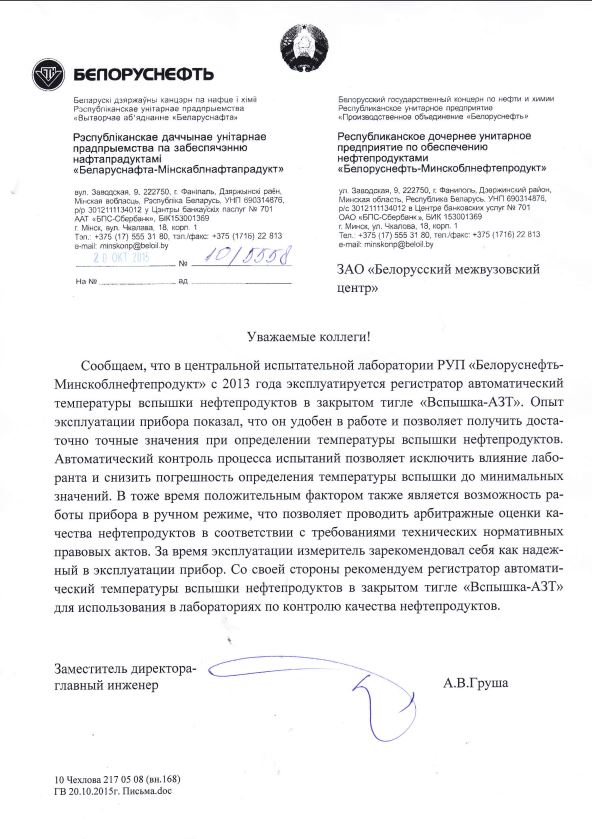 - Регистратор «Вспышка-АЗТ» измеряет температуру вспышки нефтепродуктов в закрытом тигле (метод Пенски-Мартенса по СТБ ИСО 2719-2002 метод А (ISO2719), СТБ ИСО 2719-2002 метод В (ISO2719), ГОСТ 6356-75). Устройство применяется и для определения температуры вспышки растительного масла. Такие испытания проводятся в соответствии с ГОСТ 9287.