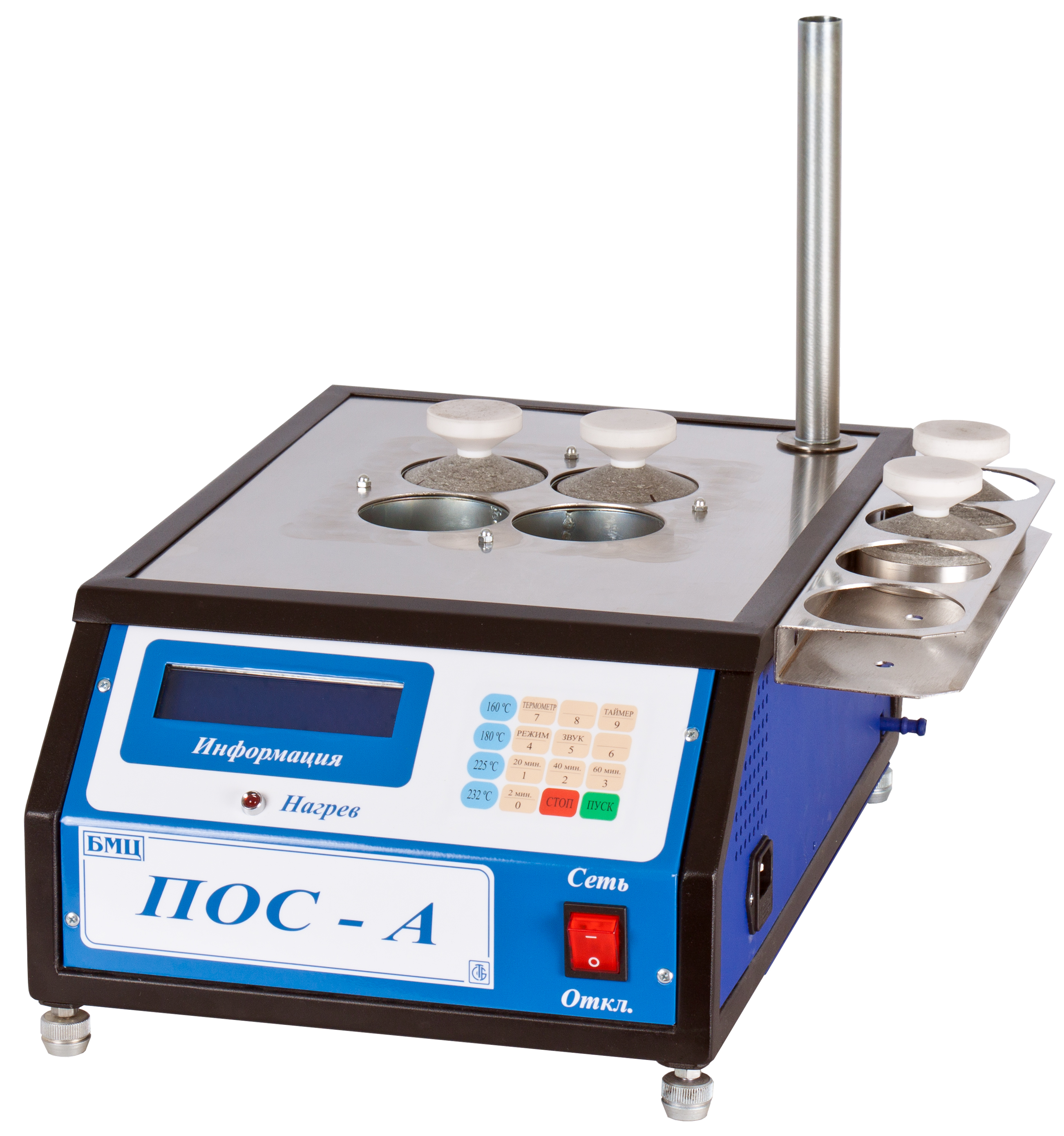 Прибор необходим при проведении опыта по определению концентрации фактических смол в моторном топливе (керосине и дизельном топливе). «ПОС-А» измеряет и поддерживает температуру при исследовании в соответствии с ГОСТ 8489-85.